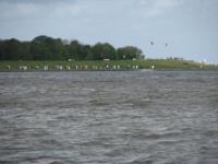 Färden gick innanför huvudvallen på en bred och bra cykelväg. Vi stannade till då och då för en liten utflykt upp på vallen för att få reda på vad som fanns på andra sidan. Väl framme i Norddeich så slog vi oss ner på fiket i färjeterminal och intog en glass. Efter klockan 18 upphörde färjetrafiken för dagen och vi cyklade bort till vårt hotel, som egentligen var en Spa-anläggning med helpension där vi lyckats boka ett strörum. Middag på fiskrestaurang som drevs av en grekisk familj. Efter maten ställdes det fram en flaska Ozu och en med svartvinbärsbrännvin sedan var det bara att ta för sig.