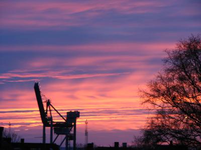 2013-12-25 Solnedgångsljus bakom Höganäs nya hamnkran.